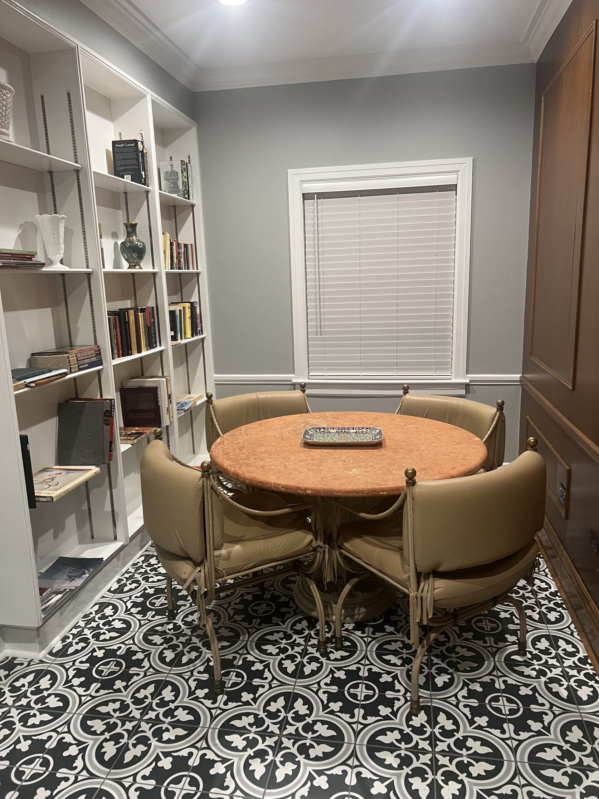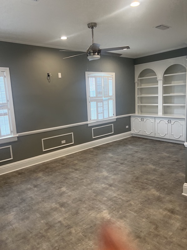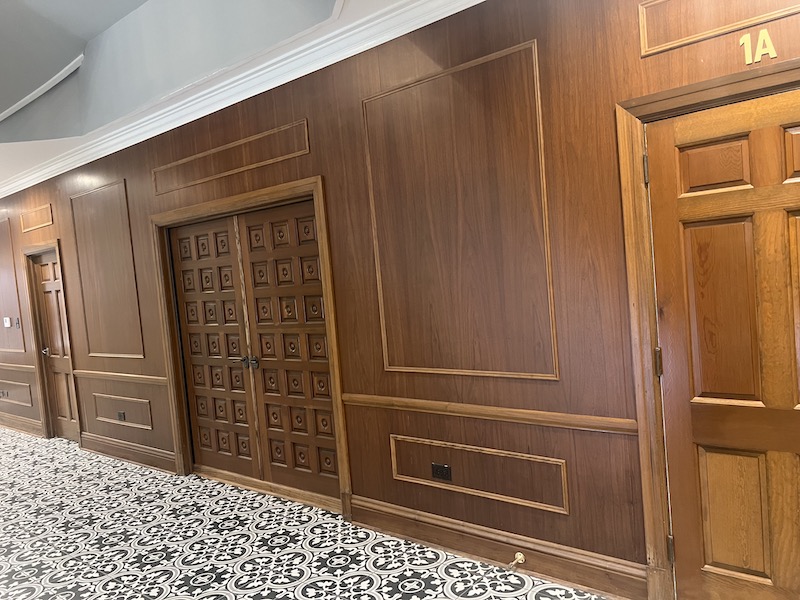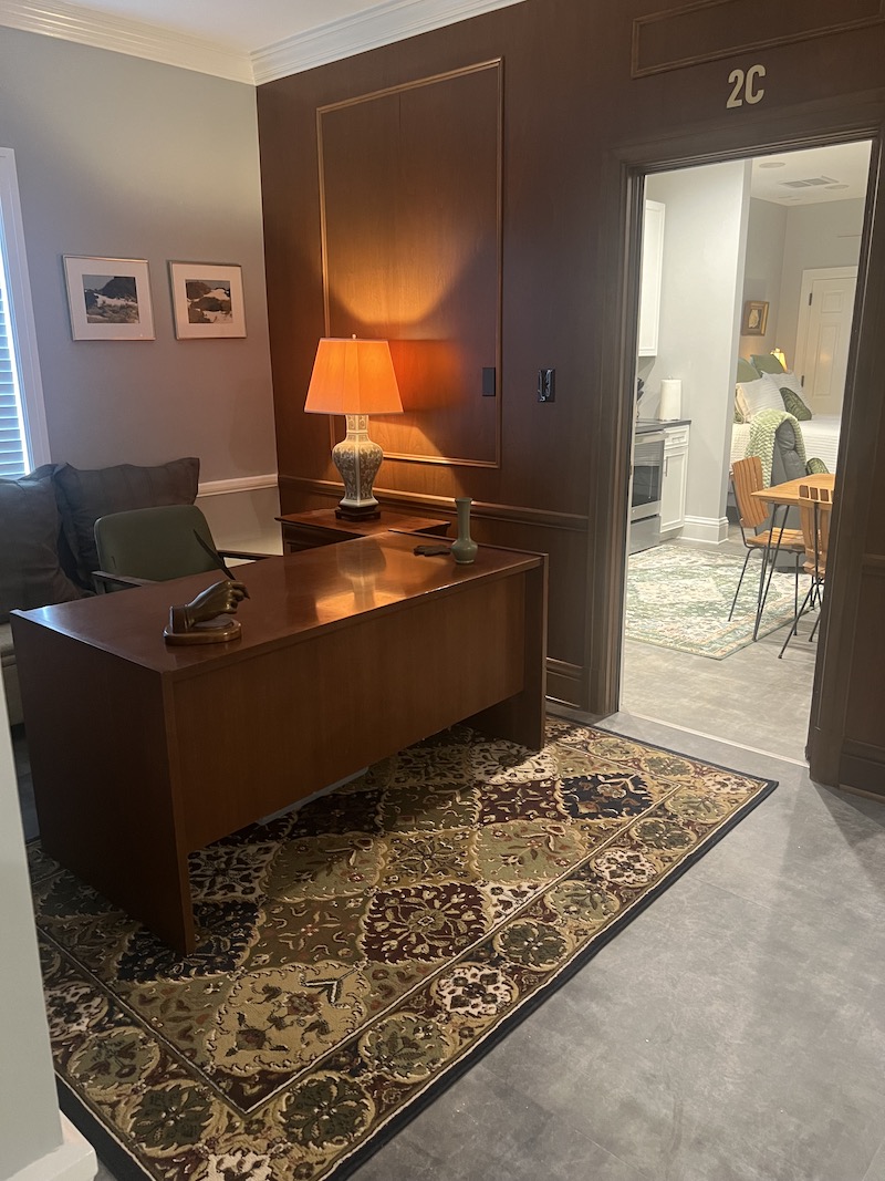 Bi-fold doors open up to a bar at District Flats apartments in PascagoulaThe former law library and conference room, which featured a “hidden” set of bifold doors in the solid wood paneling that opened up to reveal to a bar, is now the living/dining room of an apartment. The bifold doors were preserved and now open up to a bar that is adjacent to the kitchen.